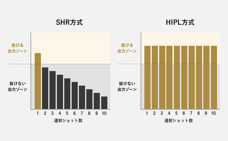 IPL脱毛とSHR脱毛の良さを兼ね備えた「HIPL脱毛」を採用。連射で脱毛効果が落ちてしまう従来の脱毛マシンを大幅にアップデートした「HIPL脱毛」は、SHR脱毛のスピード感はそのままに、連射しても安定した出力で脱毛を行うことが可能です。重ねうちの回数が軽減することで、短い施術時間でもしっかりと効果を実感していただけます。