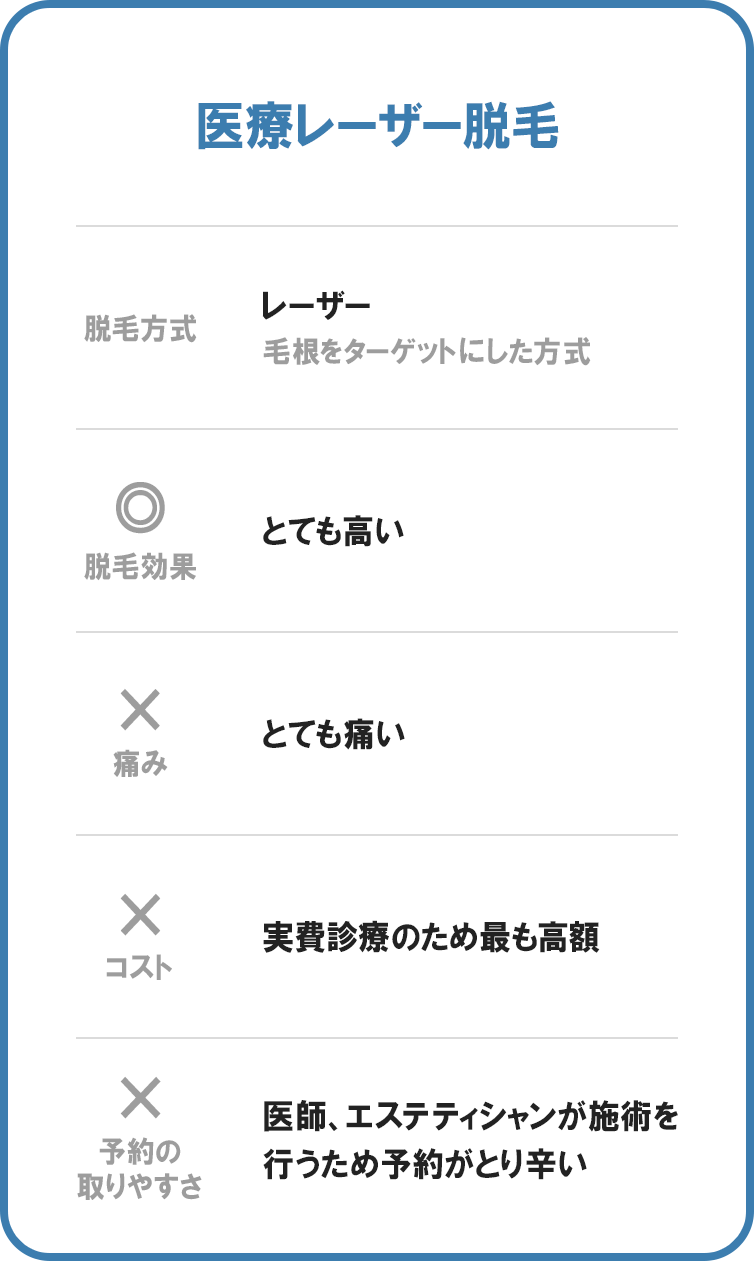 レーザーが当てやすく初回でしたが40分程で、足、腕、脇の3部位を処置することができました。お店の中も綺麗で清潔感があったのも良かったです。たぶんまたお世話になると思います。
