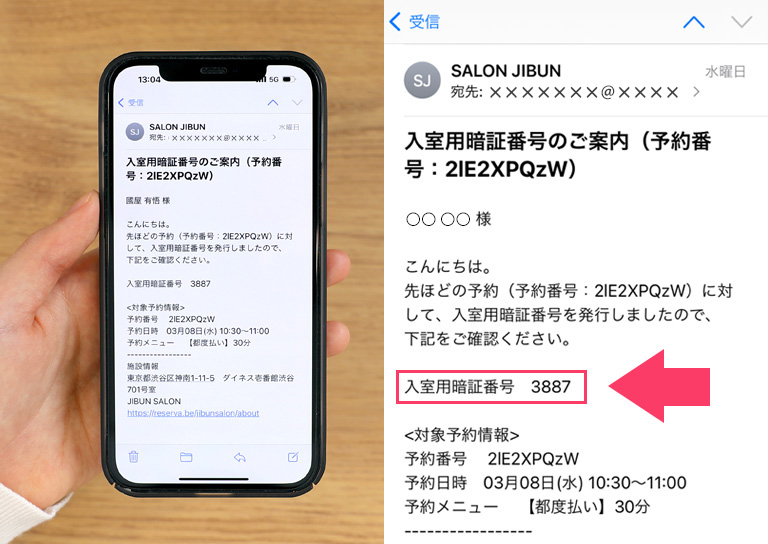 ご登録されたメールアドレスに4桁の入室用暗証番号が送信されます。 ※必ず受信可能なメールアドレスをご登録ください。
