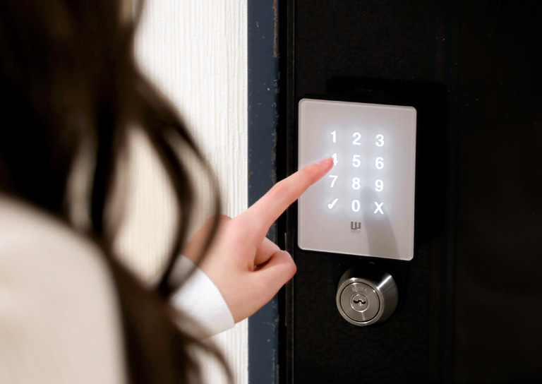 扉に設置されたキーパッドに4桁の入室用暗証番号を入力して「✓」を押して開錠・入室してください。 ※ご予約時間の5分前から入室可能です。 ※入室後オートロックが掛かります。