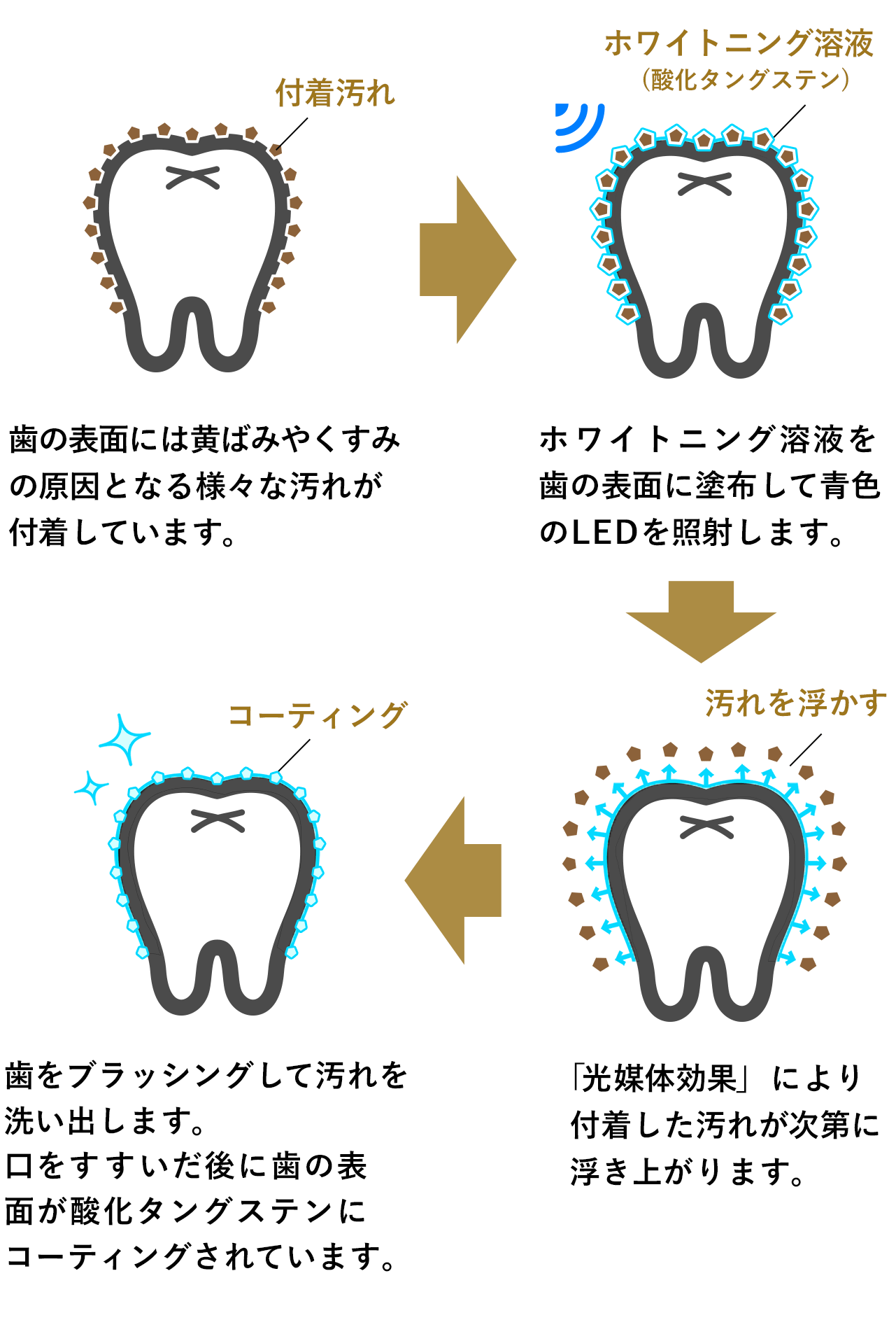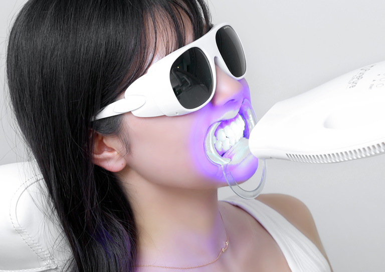 酸化タングステン+酸化チタンを配合した世界初のホワイトニングジェルを採用。歯にダメージを与えることなく、飲食や喫煙などによる黄ばみなどを落とし、歯本来の自然な白さを目指すことが可能です。またホワイトニングだけでなく殺菌・消臭・コーティングなどの効果も期待できます。