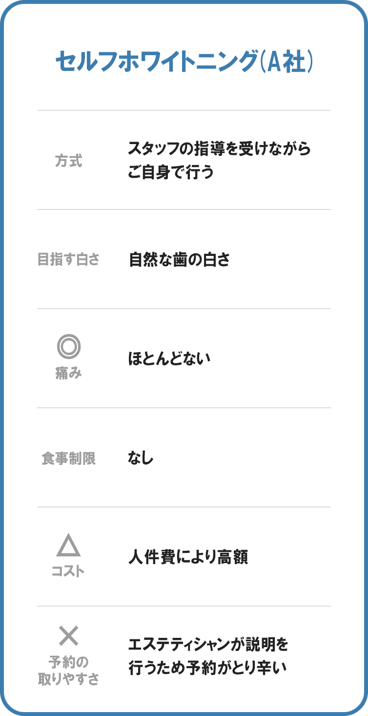 初めてセルフ脱毛・ホワイトニングを試しましたが、誰にも会わず自分のペースで施術できることがとても良かったです。 また、機械操作・手順についてはマニュアルが置いてあり、1人で行う際にもスムーズで、時間を無駄なく使えたこともかなり良かったです。 別の脱毛サロンに通っていた際は効果がイマイチでしたが、自分で納得のいくまで施術ができ、効果にも満足しています。 ホワイトニングは初めてセルフで試しましたが、すぐに効果が目に見えて感動しました。 今後も定期的に通いたいと思いました。